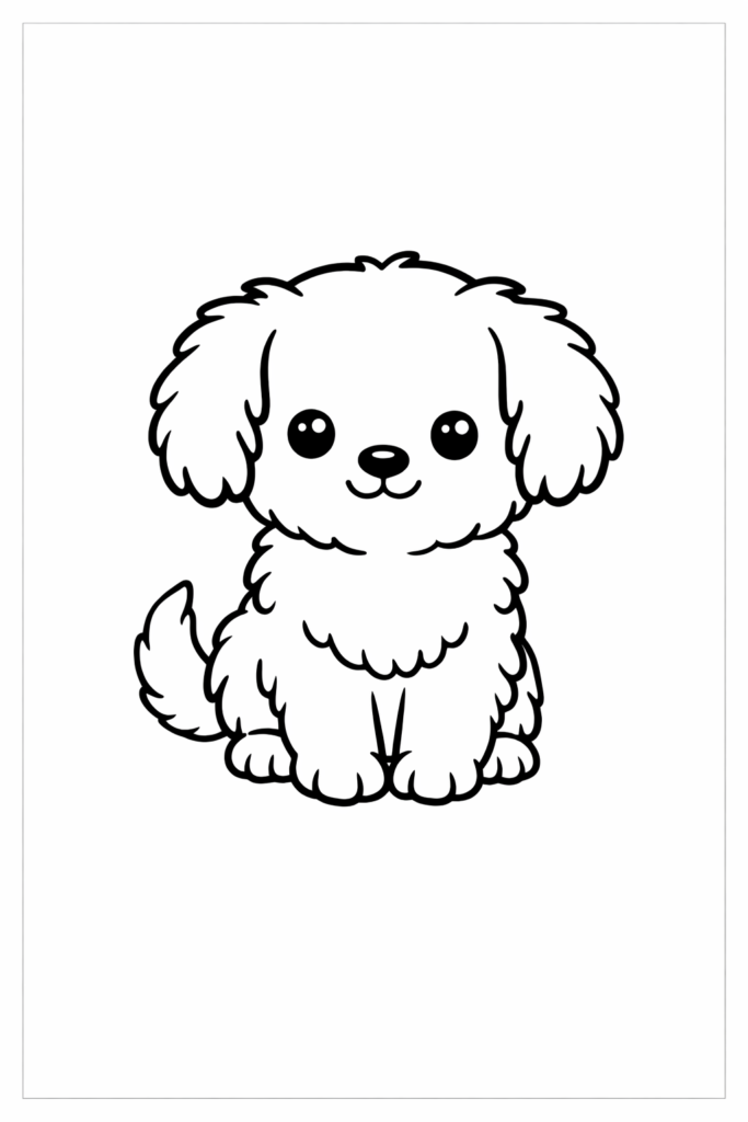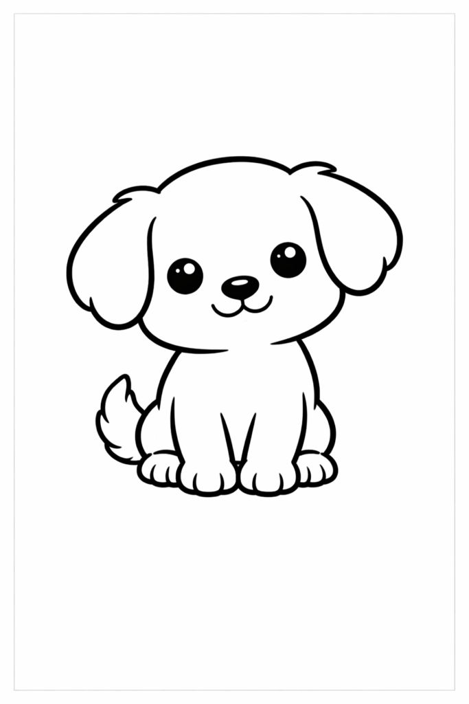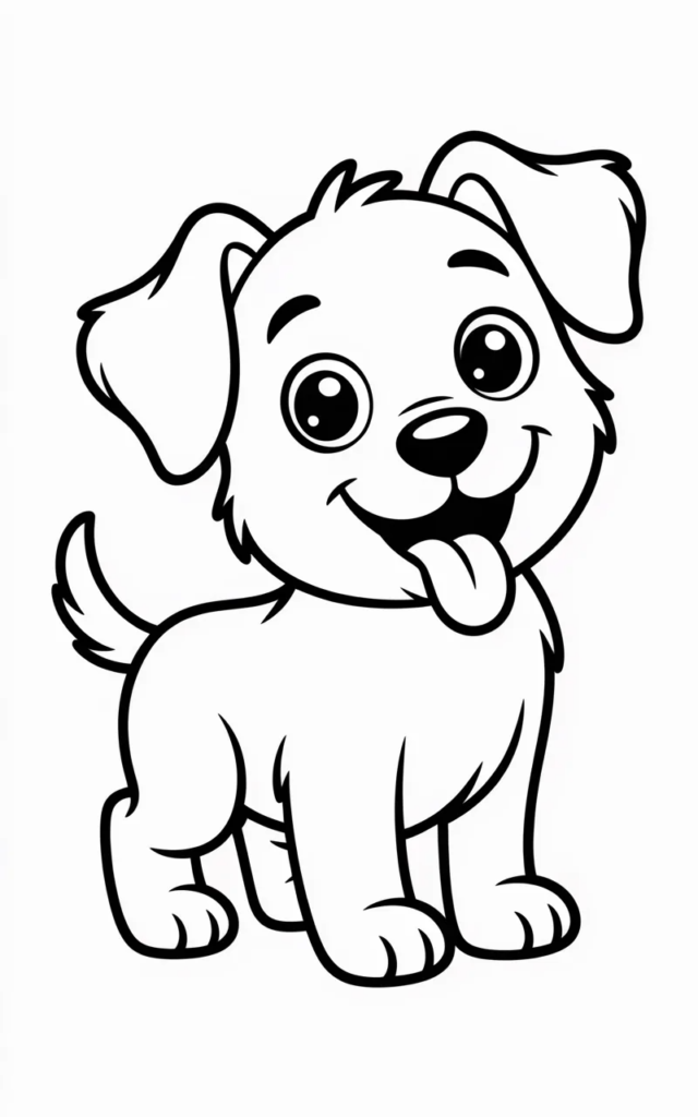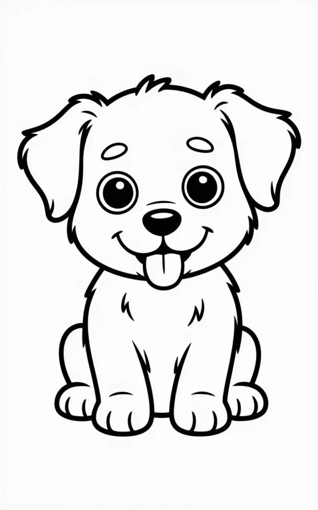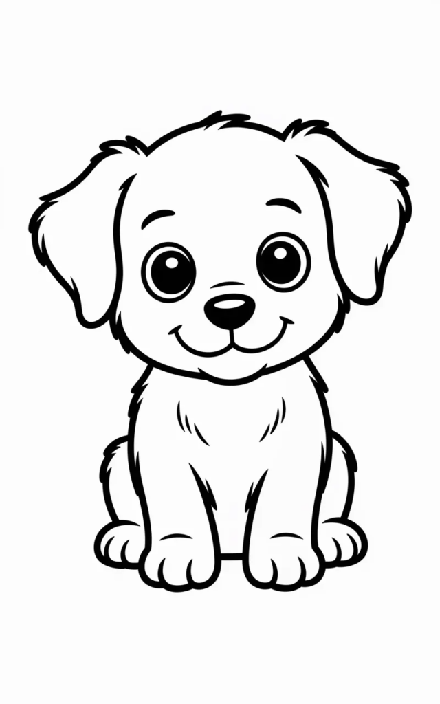 This coloring page features a cute puppy with big happy eyes and a playful smile. Kids will enjoy coloring its fluffy fur and wagging tail while experimenting with different colors.