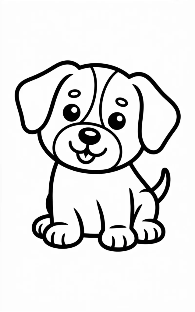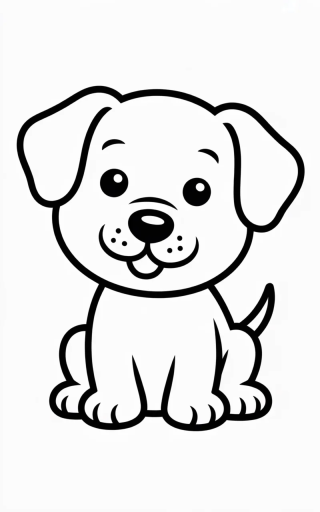 A fun cartoon-style dog sitting happily and smiling. This page is perfect for younger kids because the design is simple and easy to color.