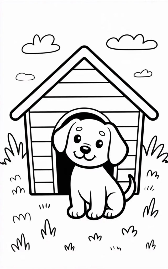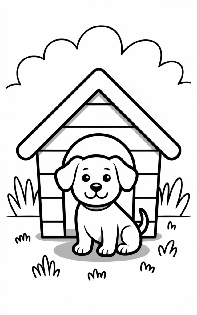 This fun coloring page features a cute dog sitting near its doghouse. Children can color the house, grass, and puppy in creative ways.