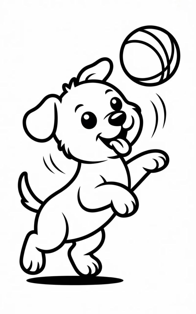 This coloring page shows an energetic puppy playing with a ball. Kids can color the scene and imagine the puppy running around happily.