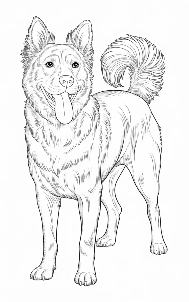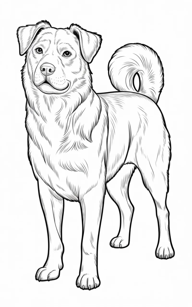 This coloring page shows a detailed dog design with realistic fur patterns. Adults and older kids will enjoy adding shading and different colors.