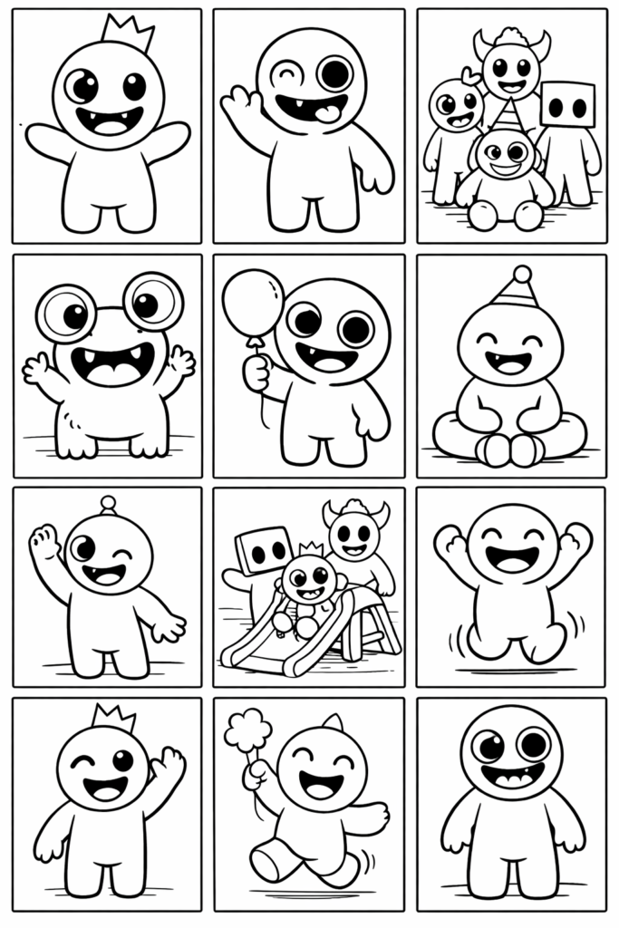Below you’ll find 10 fun and kid-friendly Rainbow Friends coloring pages that children love. Each printable sheet features simple outlines and cute characters so kids can easily color them using crayons, markers, or colored pencils.